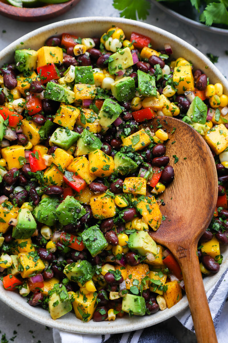 A refreshing salad with black beans, diced tomatoes, red onion, cilantro, and chunks of creamy avocado, dressed with lime vinaigrette.